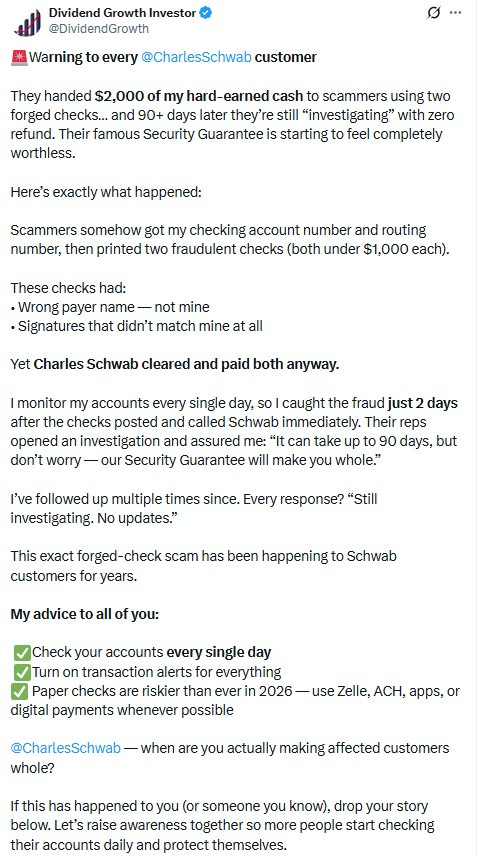 One of my early BankDealsBlog readers who has become a dividend stock investing expert just published a Twitter/X post describing how scammers stole about $2,000 via check fraud from his Charles Schwab account. He did all the right things, but he has yet to be reimbursed after more than 90 days. Here’s the link to his X post. I’ve included a snapshot of the post for those who don’t have access to X: